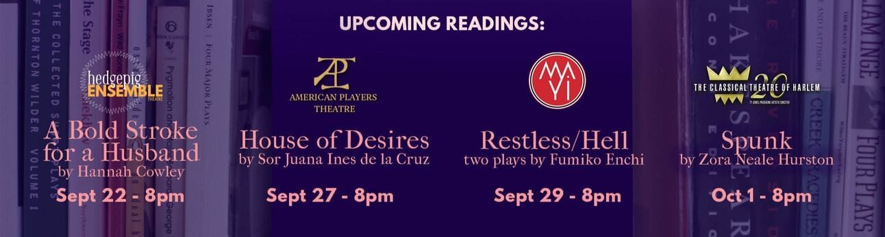 The Do This Play Reading Series*TONIGHT*Tuesday, 9/22 at 8 PM ESTBold Stroke for a Husband by Hannah Cowleydirected by Emily LyonRSVP // Learn more about this playSunday, 9/27 at 8 PM ESTHouse of Desires by Sor Juana Ines de la Cruzin partnership with American Players Theatredirected by Melisa PereyraRSVP // Learn more about this playTuesday, 9/29 at 8 PM ESTOne-Acts by Fumiko Enchiworld-premiere translations by Ayako Kanoin partnership with Ma-Yi Theatre Companydirected by Chari ArespacochagaRSVP // Learn more about this playThursday, 10/1 at 8 PM ESTSpunk by Zora Neale Hurstonin partnership with The Classical Theatre of Harlemdirected by Bianca LaVerne JonesRSVP // Learn more about this playMiss the List Drop Event where producersfrom around the country "met" the play of their dreams?Watch the recording here!