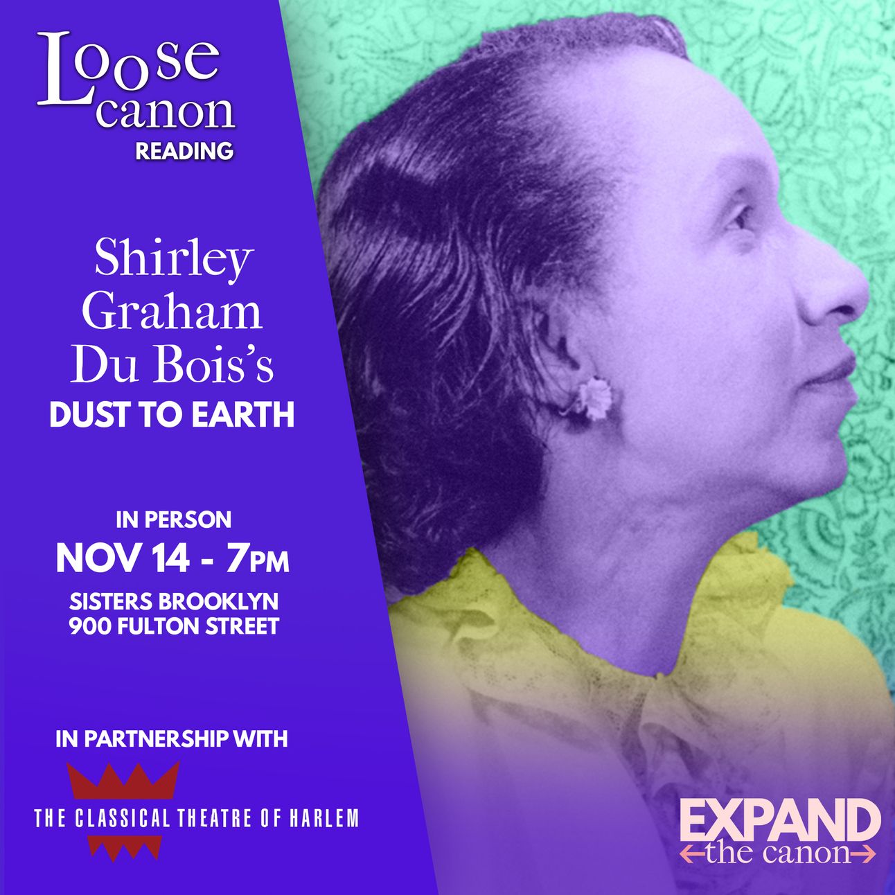 🎉WHO: You! 📖WHAT: Casual live reading of Shirley Graham Du Bois' Dust to Earth in partnership with the Classical Theatre of Harlem💥WHEN: 7pm ET (come just before to be cast!) 🗽WHERE: Sisters Brooklyn - 900 Fulton St, Brooklyn